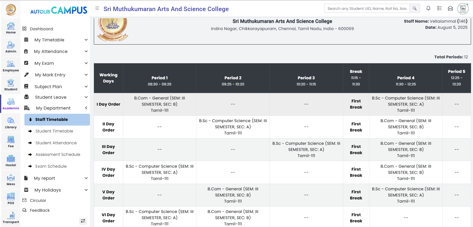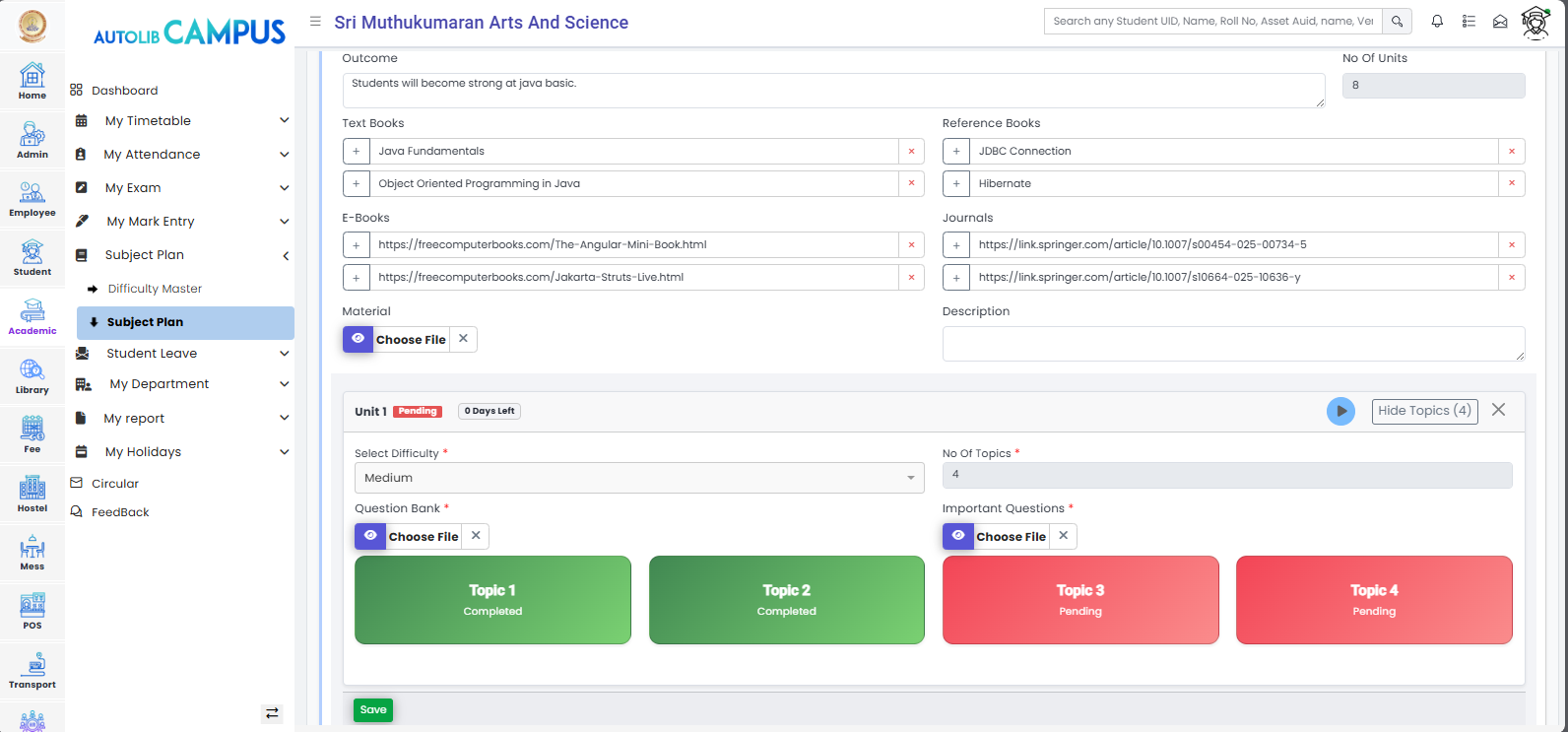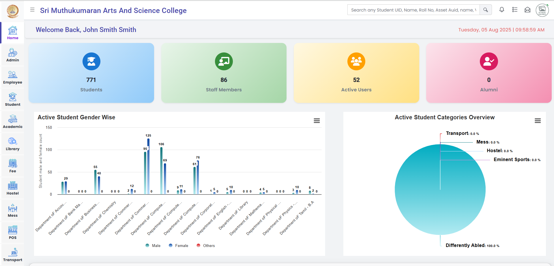 This module enables the creation of essential core masters required for the academic process, such as institution name, available shifts, department names, offered courses, batches, regulations, and employee Roles. Additionally, this module offers a wide range of features, including user authentication and security, role-based access to various modules to each staff [such as timetable, attendance, exam, mark entry and report] holiday and working day management, day order assignments, timetable generation, and more.